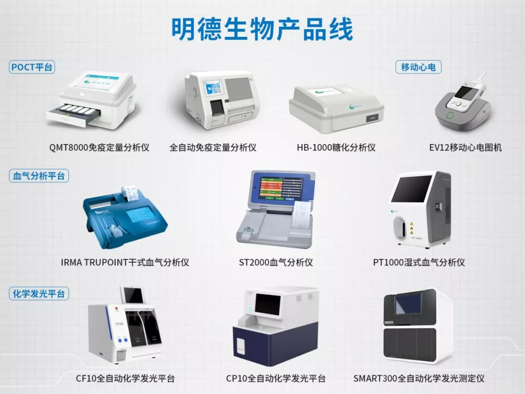 明德生物依托研發(fā)優(yōu)勢和專業(yè)化服務(wù),形成了覆蓋六大領(lǐng)域20余類疾病檢測的產(chǎn)品線,在感染性疾病診斷、心腦血管疾病診斷等領(lǐng)域占據(jù)了優(yōu)勢位置,享有良好口碑。公司研制的檢測產(chǎn)品已經(jīng)進(jìn)入全國3000多家醫(yī)療機(jī)構(gòu)。明德注重產(chǎn)品研發(fā)和技術(shù)創(chuàng)新,目前已經(jīng)陸續(xù)上市了糖化、化學(xué)發(fā)光、血?dú)夥治、分子診斷、胸痛中心、心電網(wǎng)絡(luò)等多項產(chǎn)品和服務(wù)。