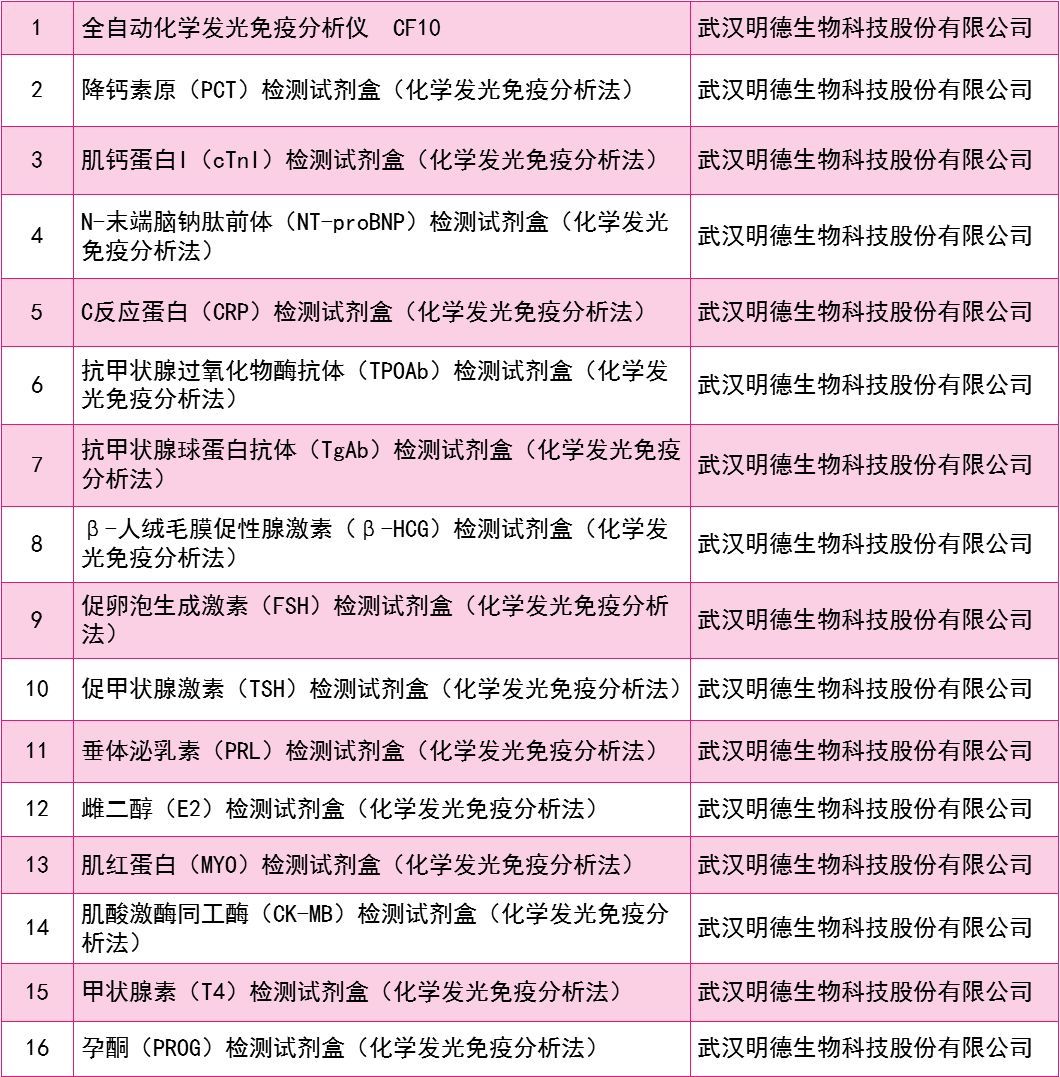 明德生物共16項產(chǎn)品獲 “2018年度武漢市醫(yī)療器械領域創(chuàng)新產(chǎn)品”認定,如下表: