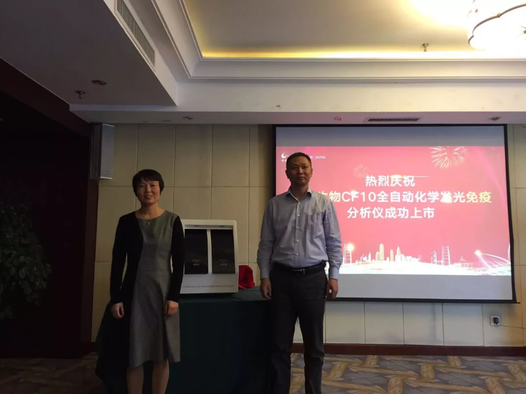 在掌聲中,王玉明教授與陳莉莉董事長一起揭幕了明德全血POCT化學(xué)發(fā)光新品-CF10。