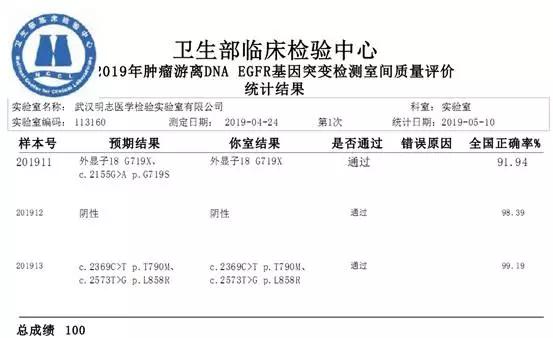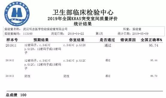 明德生物控股子公司武漢明志醫(yī)學(xué)檢驗(yàn)實(shí)驗(yàn)室有限公司參加衛(wèi)生部臨檢中心EGFR、腫瘤游離DNAEGFR、ALK、KRAS、氯吡格雷藥物代謝基因(CYP2C19)、人乳頭瘤病毒(HPV)分型共6個(gè)項(xiàng)目第一次室間質(zhì)量評價(jià)結(jié)果全部滿分通過,再次驗(yàn)證了明志醫(yī)學(xué)檢驗(yàn)室實(shí)驗(yàn)的檢測流程規(guī)范,判讀準(zhǔn)確。