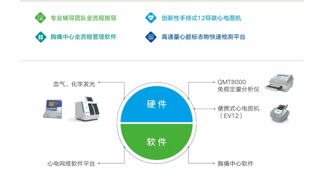 其中QMT8000平臺和化學(xué)發(fā)光POCT平臺,均能夠在20分鐘內(nèi)給出檢測結(jié)果(包括心梗三項(xiàng)、D-Dimer 和NT-proBNP、BNP等),可同時(shí)檢測多個(gè)項(xiàng)目,性能契合胸痛中心建設(shè)要求。創(chuàng)新手持式12導(dǎo)聯(lián)心電圖機(jī)小巧便攜,具有多種數(shù)據(jù)傳輸方式,匹配標(biāo)準(zhǔn)中關(guān)于首觸后10min內(nèi)完成心電圖檢查并具有心電報(bào)告遠(yuǎn)程傳輸能力的要求。