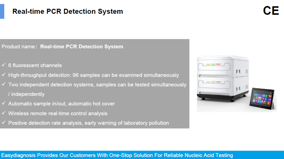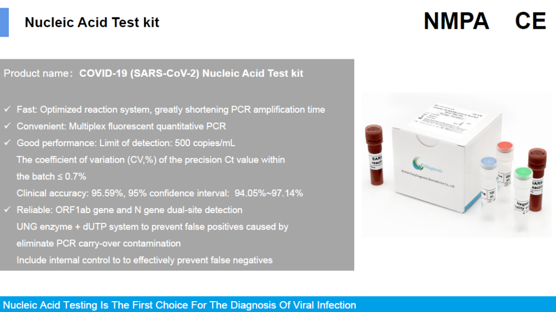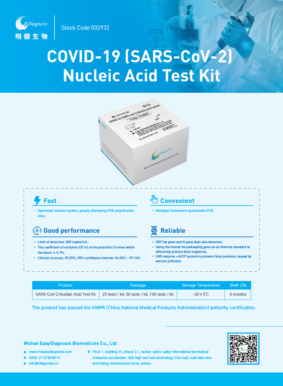 明德生物新型冠狀病毒 (2019-nCoV) 核酸檢測試劑盒(熒光PCR法)兼容性佳,可兼容具備FAM、VIC、ROX 通道的實(shí)時熒光定量PCR儀;且與市場同類的常規(guī)熒光PCR試劑相比節(jié)省了30-40分鐘的上機(jī)檢測時間;在性能方面,靈敏度可達(dá)中檢院國家靈敏度參考品S6水平,精密度高。能夠有效、快速地支持新型冠狀病毒患者診斷,滿足全球范圍內(nèi)疫情現(xiàn)場的快速檢測需求,助力國際新冠疫情防控工作。