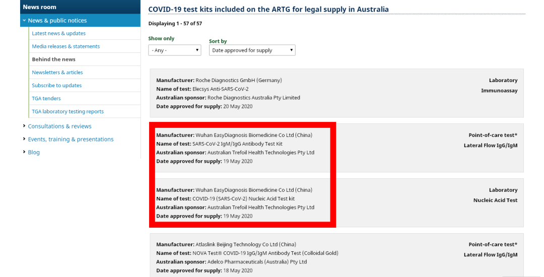 2020年5月19日,明德生物新型冠狀病毒(2019-nCoV)核酸檢測試劑盒(熒光PCR法)和新型冠狀病毒(2019-nCoV)IgM/IgG抗體檢測試劑盒(膠體金法)均通過澳大利亞藥品管理局Therapeutic Goods Administration(TGA)認(rèn)證。代表著明德生物的新冠核酸試劑和抗體試劑具備了進(jìn)入澳大利亞銷售的資格。