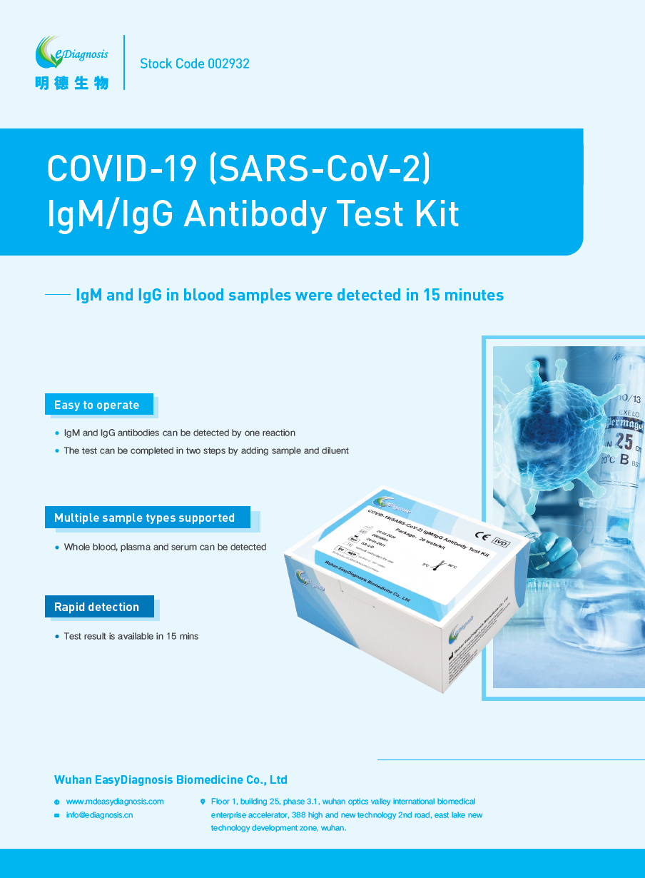 在本次新冠肺炎抗“疫”阻擊戰(zhàn)中,明德生物作為武漢本土醫(yī)療企業(yè),整個疫情期間堅(jiān)持研發(fā)、生產(chǎn)和銷售,成功獲得新冠核酸檢測試劑注冊證,積極投身人類抗“疫”戰(zhàn)爭,全力為疫情防控提供檢測服務(wù)。同時,新型冠狀病毒核酸檢測試劑盒、核酸提取試劑、新型冠狀病毒IgM/IgG抗體檢測試劑盒(膠體金法)、血?dú)夥治鰞x、血?dú)鈾z測試劑盒、高敏C反應(yīng)蛋白(hs-CRP)檢測試劑盒共6項(xiàng)產(chǎn)品獲得歐盟CE準(zhǔn)入,為全球疫情防控工作提供了有效檢測工具。