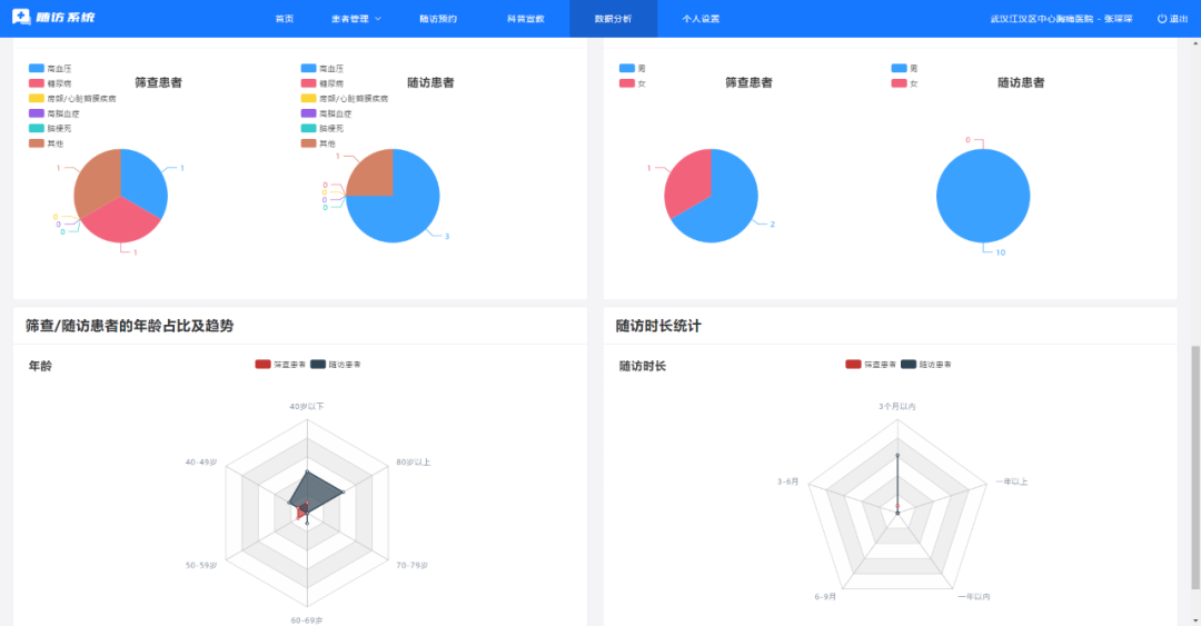 面向醫(yī)護,隨訪平臺提供了患者檔案管理,高;颊叩暮Y查,日常隨訪計劃執(zhí)行及隨訪內(nèi)容記錄,同時可根據(jù)患者的需求推送相關(guān)科普宣教內(nèi)容,此外將數(shù)據(jù)形成報表及圖表提供給醫(yī)護以進行病情及工作情況的分析。