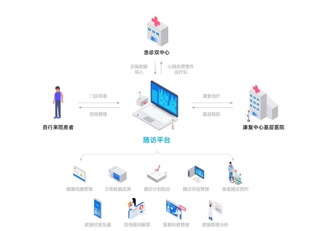 從醫(yī)院實際需求出發(fā),結(jié)合國家胸痛中心政策要求,力求解決醫(yī)患依從性不夠,隨訪記錄零散,數(shù)據(jù)未錄入系統(tǒng),以及大量隨訪療效無法監(jiān)測等問題,融合急危重癥雙中心建設(shè)平臺,搭建完整的院前-院中-院后診療閉環(huán),完成篩防、治、管一體隨訪平臺建設(shè)。