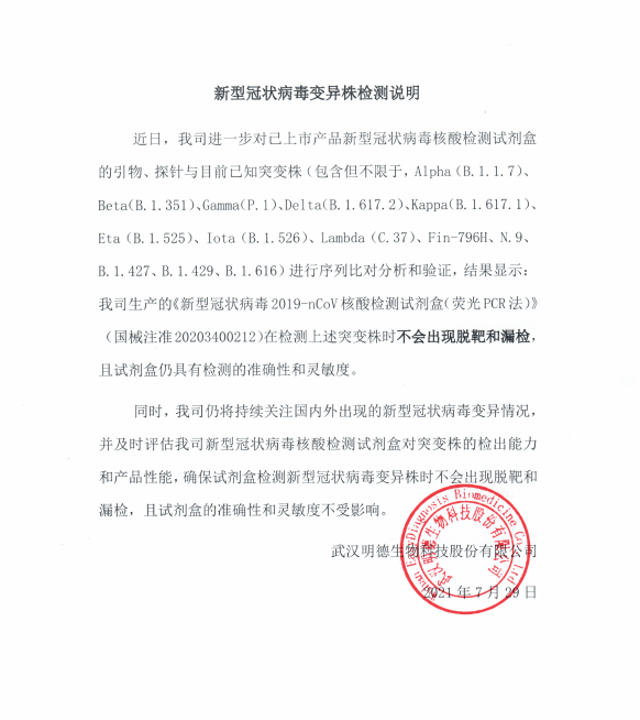 面對“德爾塔”變異毒株的加速傳播,此前明德生物已對新冠病毒變異株檢測進(jìn)行了序列比對分析和驗(yàn)證,結(jié)果顯示明德生物生產(chǎn)的新型冠狀病毒2019-nCoV核酸檢測試劑盒(熒光PCR法)(國械注準(zhǔn)20203400212)在檢測突變株時(shí)不會(huì)出現(xiàn)脫靶和漏檢,且試劑盒仍具有檢測的準(zhǔn)確性、特異性和靈敏度!中建三局武漢市沌口項(xiàng)目工地是武漢本輪輸入性疫情的源頭,8月2日的7例陽性病例即由明德生物新冠核酸檢測試劑檢出!子彈已上膛,迎戰(zhàn)疫情,勢如破竹。