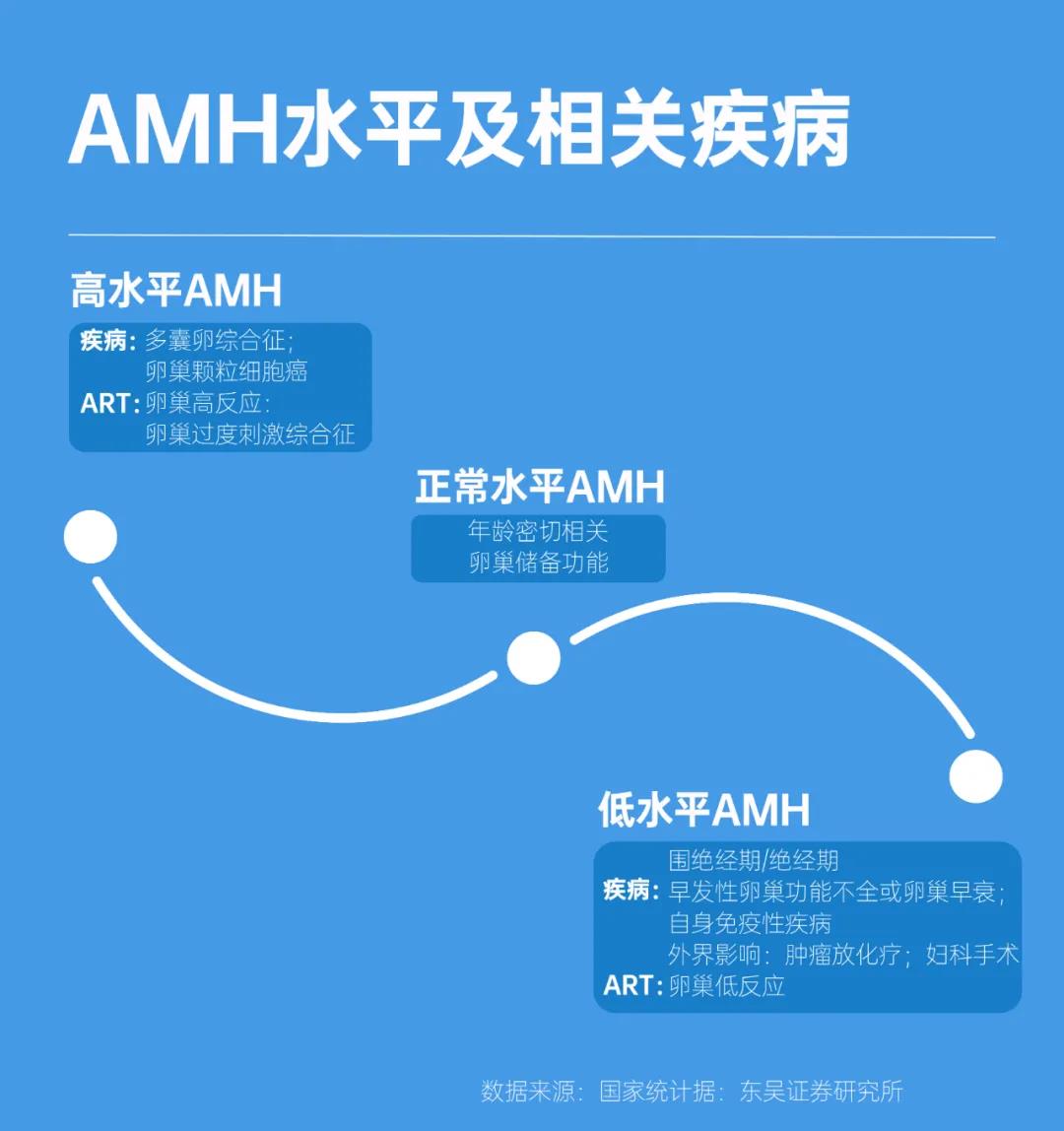 抗繆勒氏管激素(AMH)相較于傳統(tǒng)的促卵泡生成素(FSH)、雌二醇(E2)、促黃體生成激 素(LH)等檢測(cè)項(xiàng)目,具有特異性更強(qiáng)、受女性月經(jīng)周期與避孕藥物影響更小等優(yōu)勢(shì),是卵巢儲(chǔ)備功能預(yù)測(cè)的優(yōu)選指標(biāo),目前已成為大中型醫(yī)療機(jī)構(gòu)主流檢測(cè)項(xiàng)目之一。