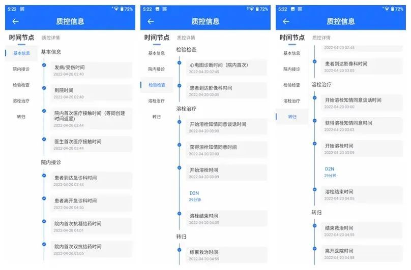 救治過程中,各項關鍵時間節(jié)點通過胸痛中心信息化系統(tǒng),結合物聯(lián)網的方式自動記錄采集,幫助醫(yī)護在緊張的救治過程中快速記錄時間節(jié)點,使得醫(yī)護精力可以專注在危重患者救治上,在救治的同時,實時掌握質控指標達成情況。